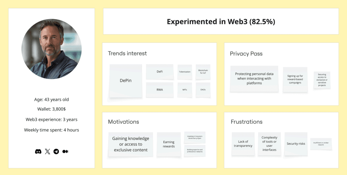 J’ai ensuite consacré plusieurs semaines à analyser ces données, segmenter les profils et identifier des tendances claires. Deux grands types d’utilisateurs se distinguaient : des profils déjà familiers du Web3, en quête d’outils performants, et des profils plus curieux mais freinés par la complexité technique.